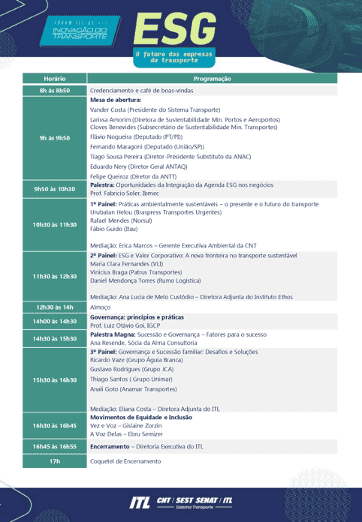 O FIT é uma iniciativa do ITL (Instituto de Transporte e Logística), em colaboração com a CNT (Confederação Nacional do Transporte) e o SEST SENAT (Serviço Social do Transporte e Serviço Nacional de Aprendizagem do Transporte). Por meio de cases de sucesso e melhores práticas, o Fórum reunirá organizações públicas e privadas que estão liderando a implementação de práticas de ESG no transporte, além de destacar seus desafios, sucessos e lições aprendidas. Nesta quarta edição, haverá ainda uma sessão especial dedicada à sucessão familiar.